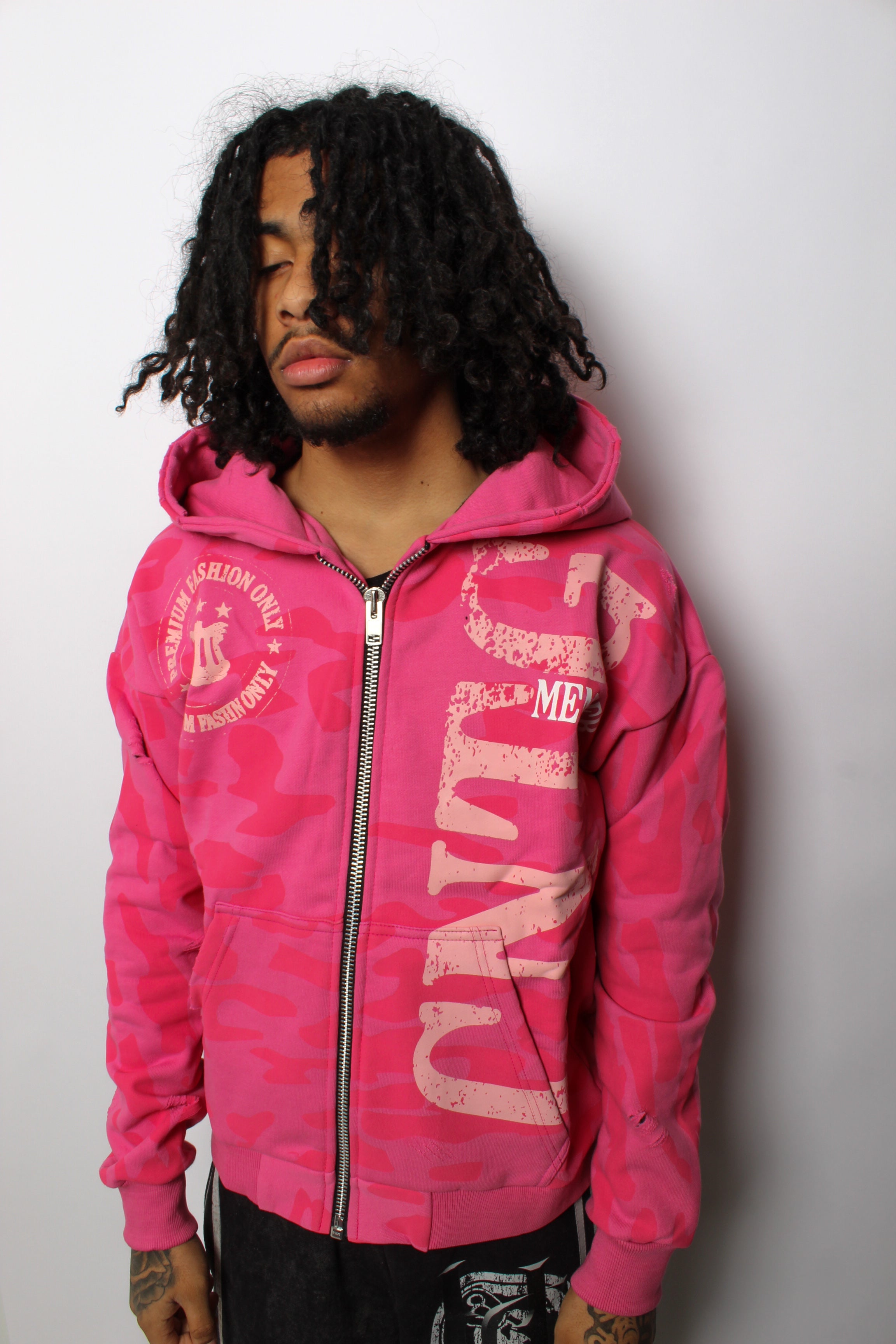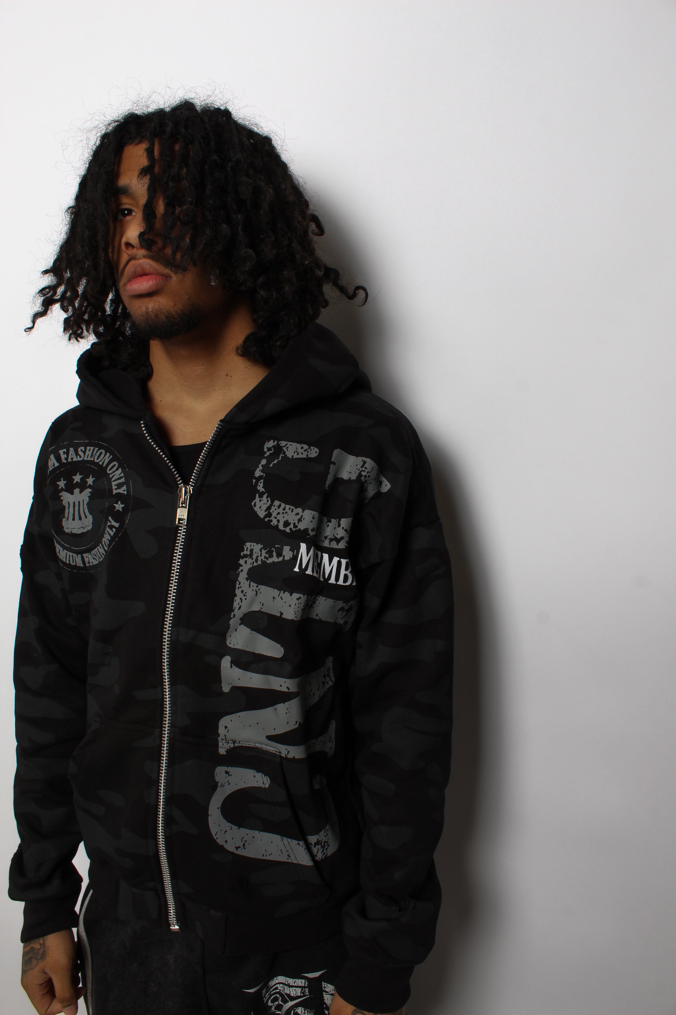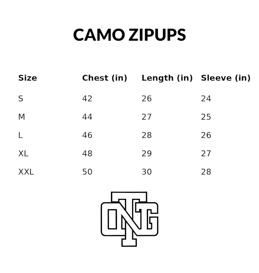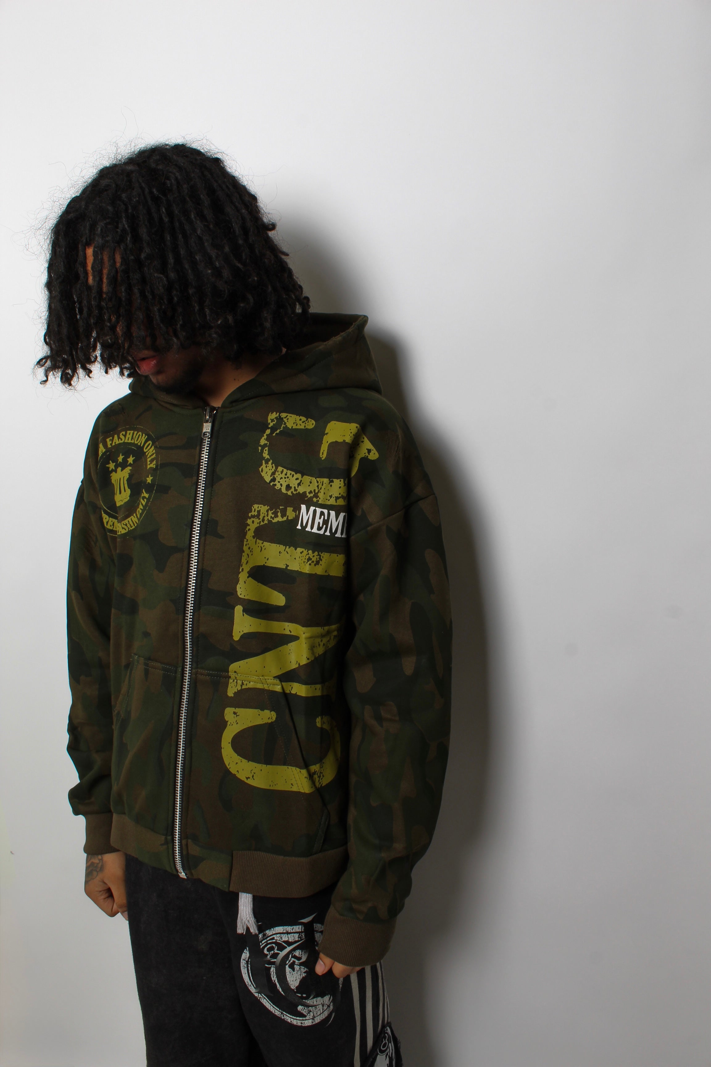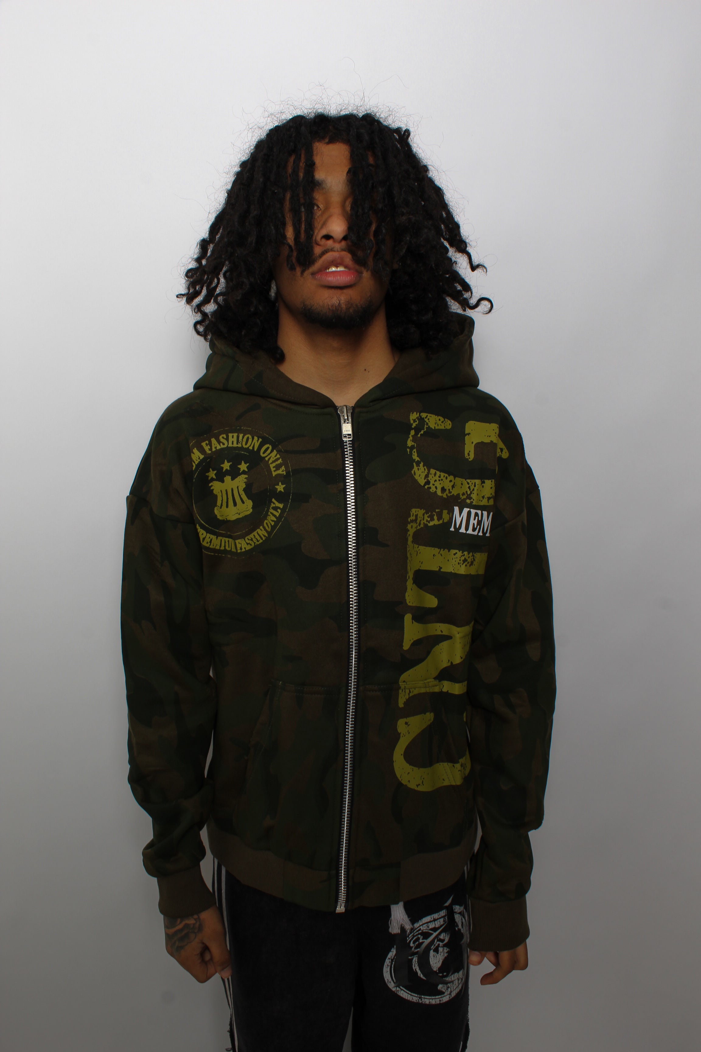 Details: Custom camo print and oversized zipper for a bold, statement look that separates it from standard basics