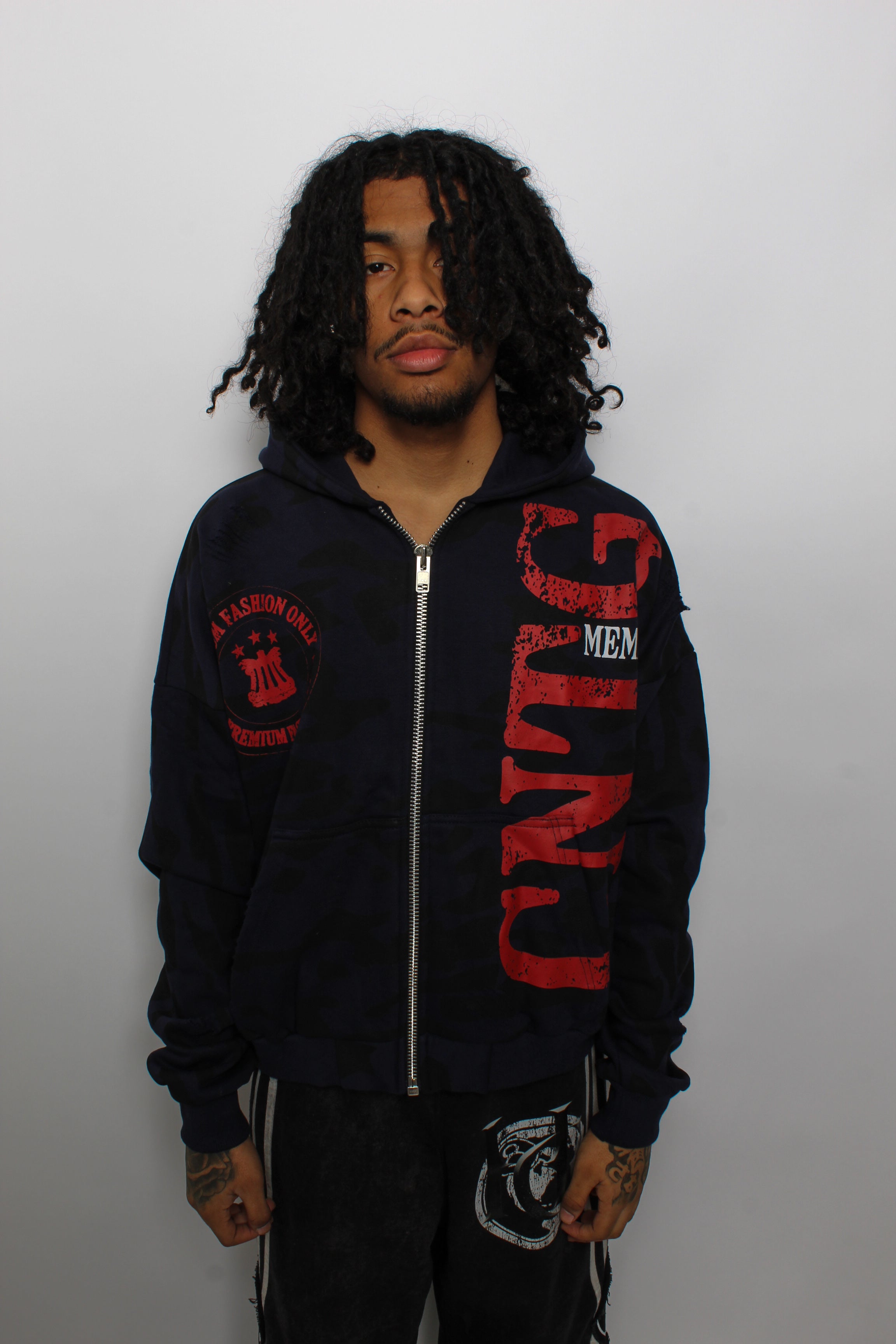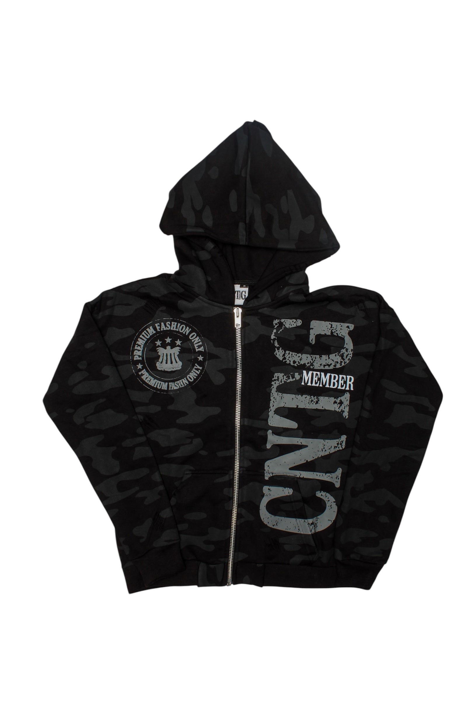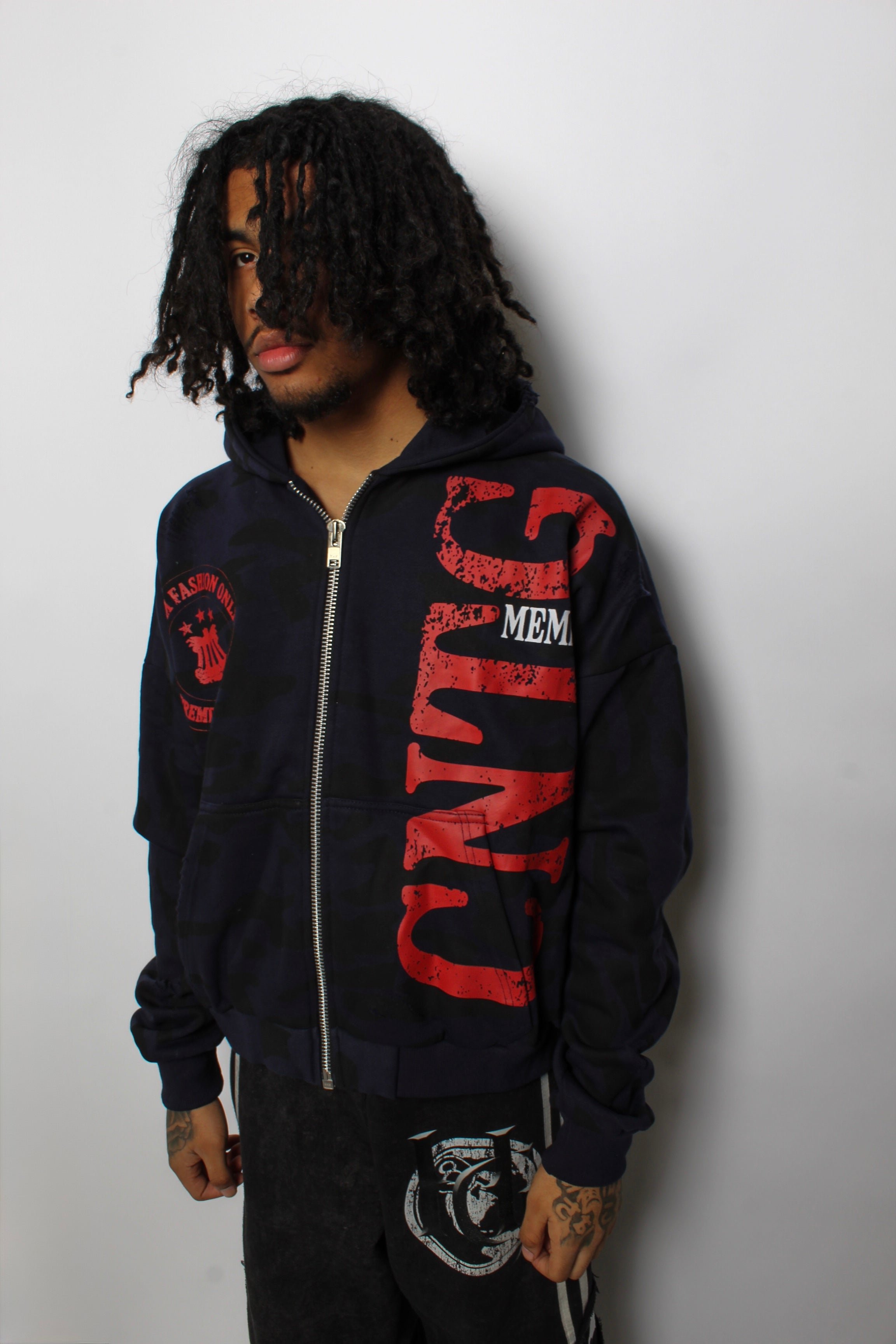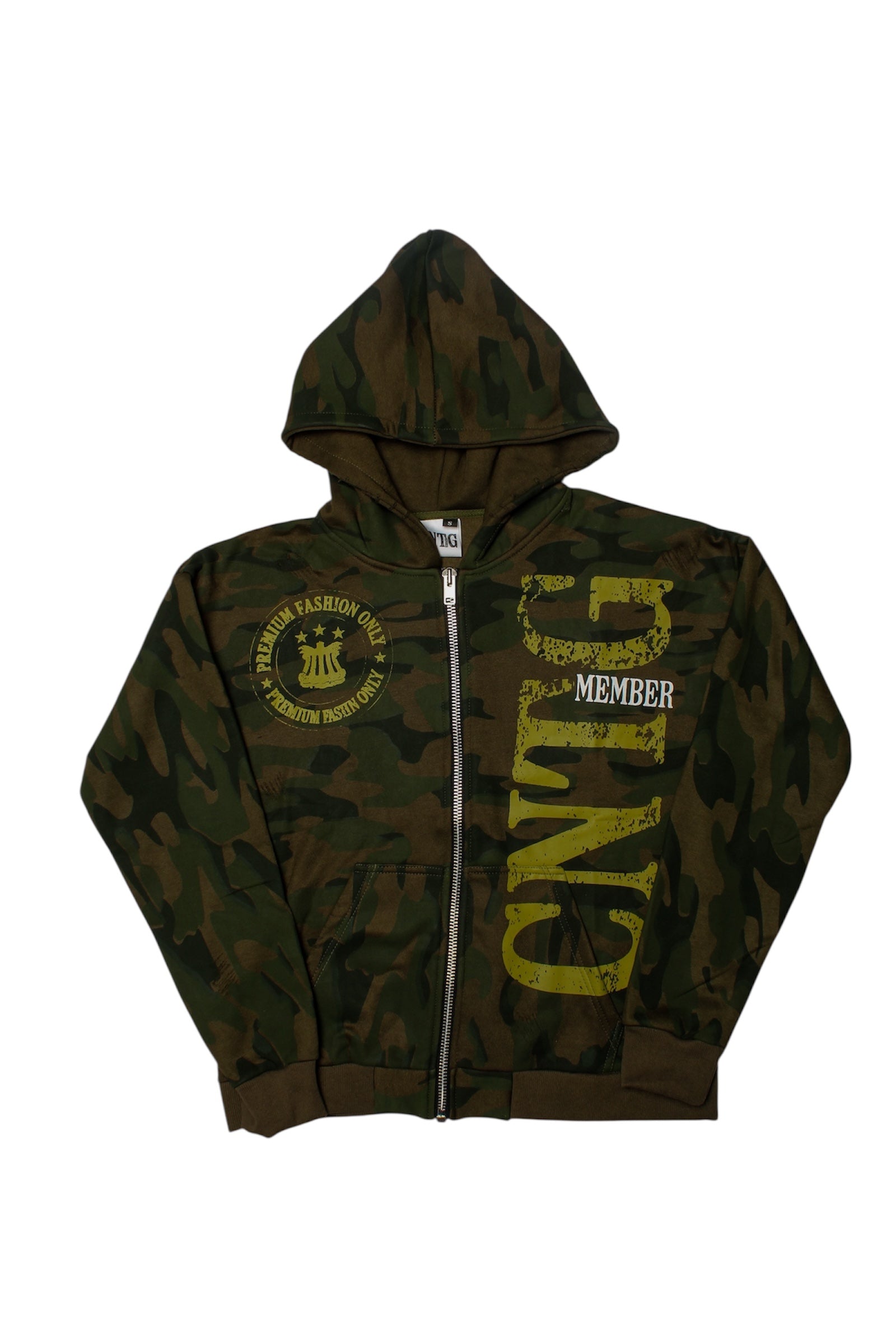Details: Custom camo print and oversized zipper for a bold, statement look that separates it from standard basics